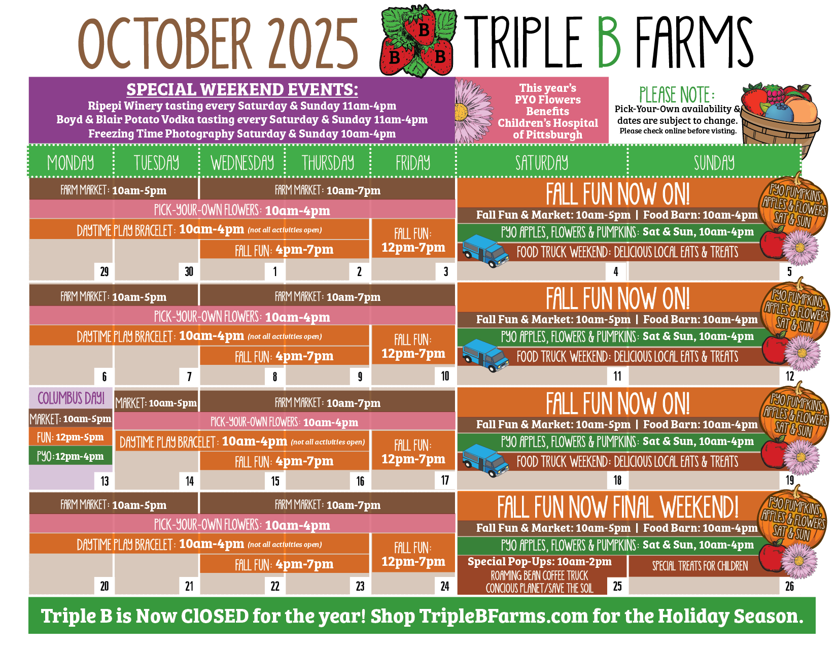 Just 15 miles from downtown Pittsburgh, Triple B Farms has welcomed families and guests to their farmstead since 1985. Enjoy fresh country air and inspiring natural fun, while you explore and shop for local professionally-grown fruits and vegetables, fresh baked goods, home made fudge, and gift baskets. Pop’s Farmyard is perfect for family memories – animals, learning and acres of fun. Worth the Drive since 1985!